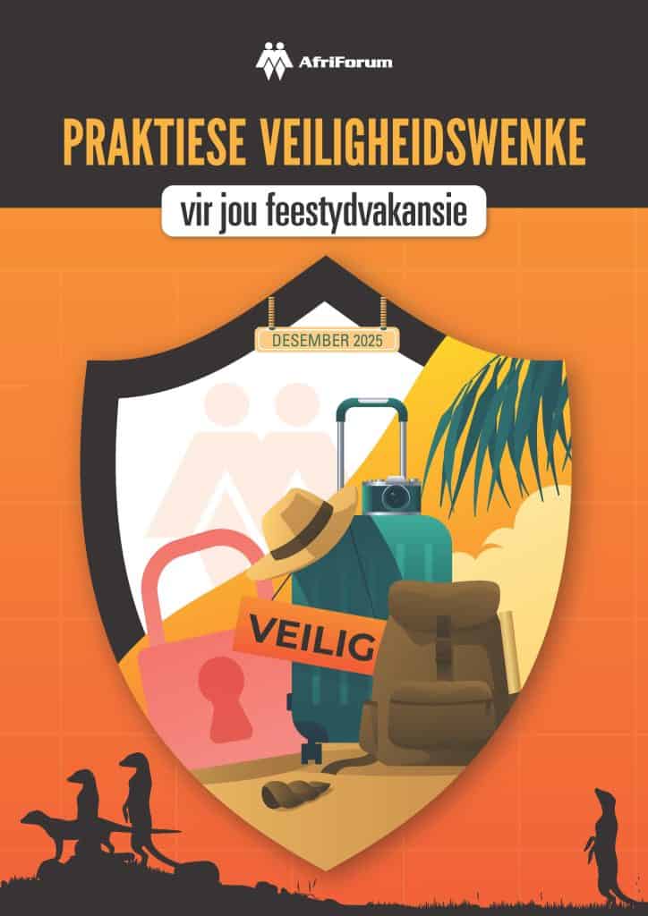 Laai AfriForum se vakansieveiligheidsgids hiér af en maak seker dat jy en jou gesin veilig bly tydens die feestyd. Hierdie gids bied praktiese wenke om jou huis, voertuig en geliefdes te beskerm teen die stygende misdaad wat elke jaar gedurende die vakansieseisoen voorkom. Bly voorbereid, bly waaksaam en neem beheer van jou veiligheid deur die gratis gids af te laai.